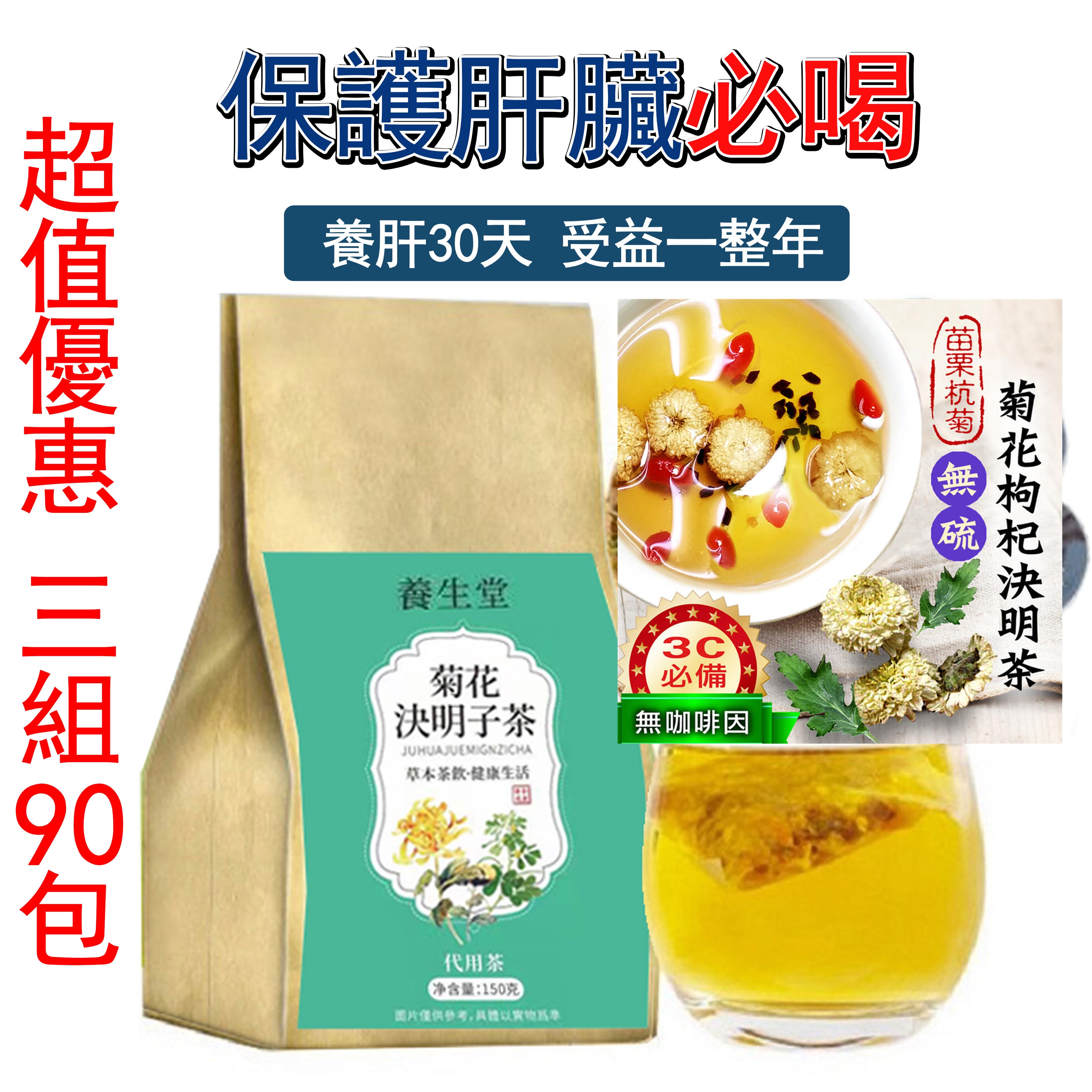 2分鐘前決明子菊花養生茶,每天喝一杯,熬夜疲憊,過度用眼,喝酒抽煙,膚色暗沉,脾氣不好的煩惱,統統不見! - 【超值優惠3入組共90包】NT$799